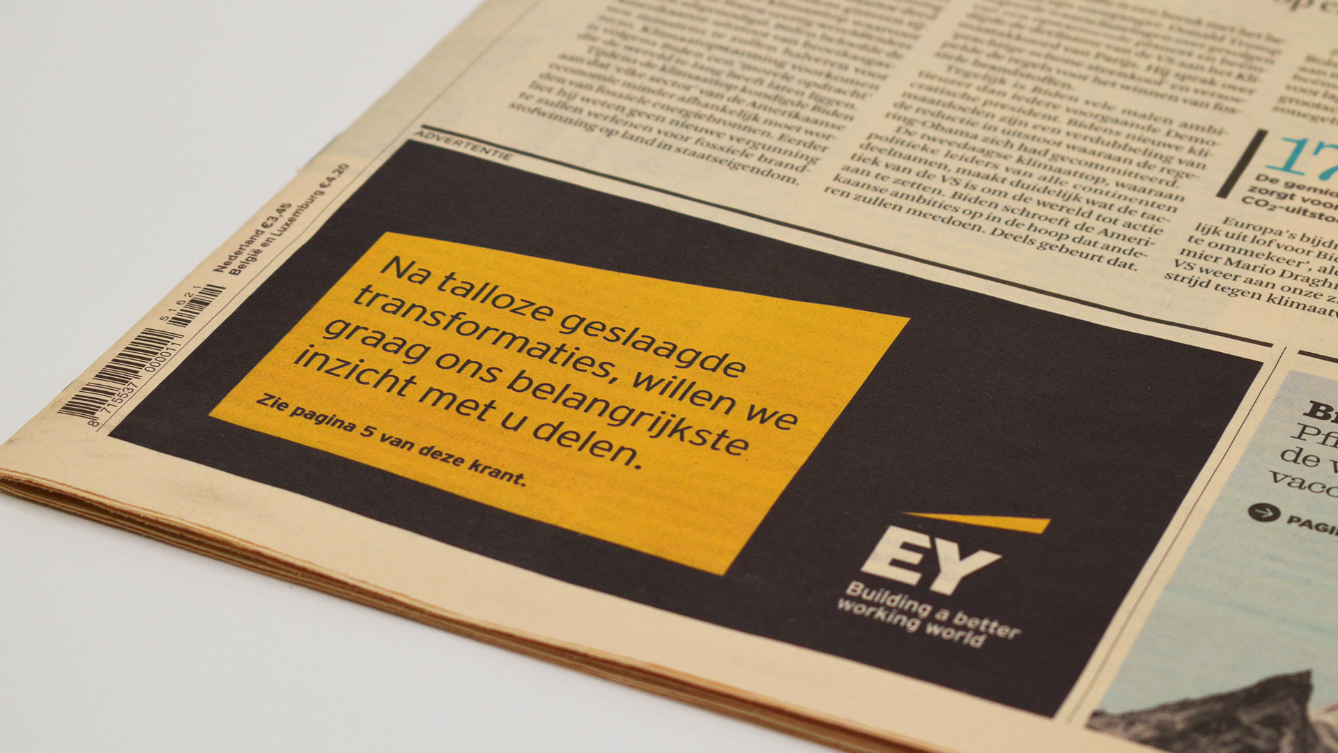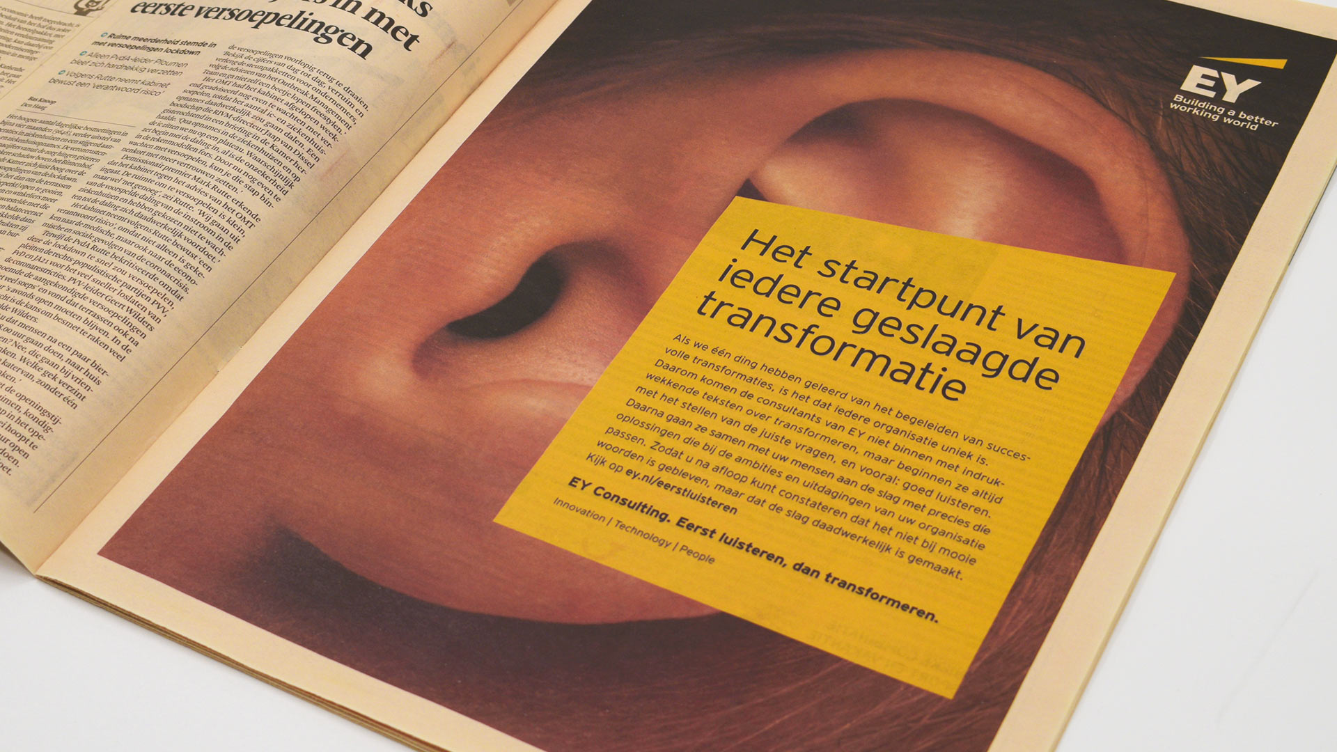 De meeste mensen kennen EY vooral als één van de vier grote accountancy firma’s. Minder bekend is dat EY ook een belangrijke consultancytak heeft. Onze opdracht: breng die onder de aandacht, op een manier die recht doet aan het onderscheidende karakter van de consultants van EY.