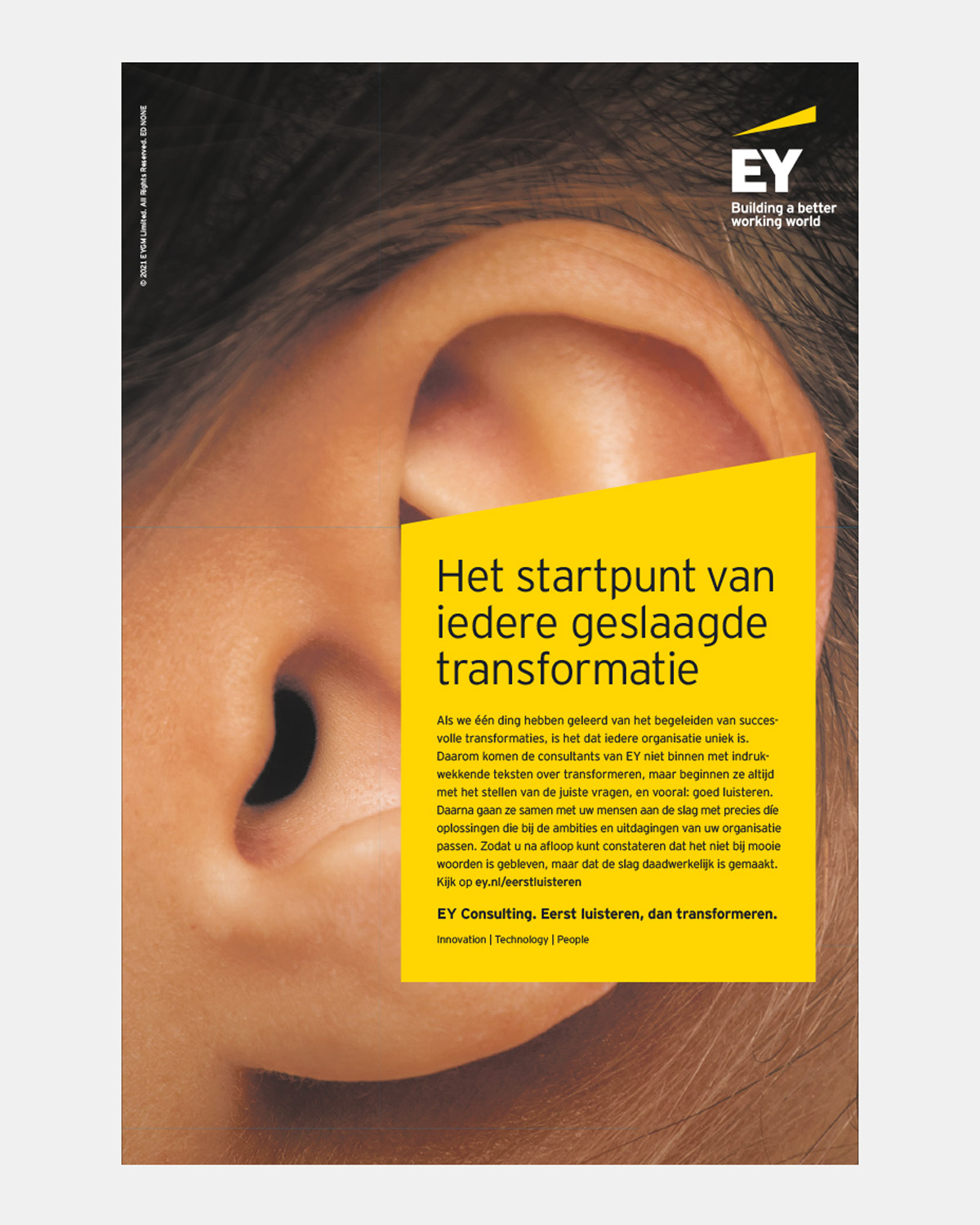 De meeste mensen kennen EY vooral als één van de vier grote accountancy firma’s. Minder bekend is dat EY ook een belangrijke consultancytak heeft. Onze opdracht: breng die onder de aandacht, op een manier die recht doet aan het onderscheidende karakter van de consultants van EY.