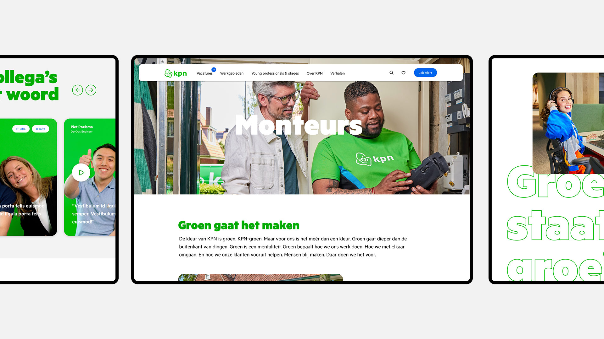 De purpose van KPN is eenvoudig, maar ambitieus: van Nederland het beste digitale land ter wereld maken. Dat lukt alleen met de beste mensen, op alle niveaus in de organisatie, van monteurs en medewerkers in de winkels en het callcenter tot de netwerk- en securityspecialisten en de data- en IT professionals. Waar ze ook zitten en wat ze ook doen bij KPN, hun werk is van grote betekenis voor de vooruitgang van mensen en organisaties in Nederland.