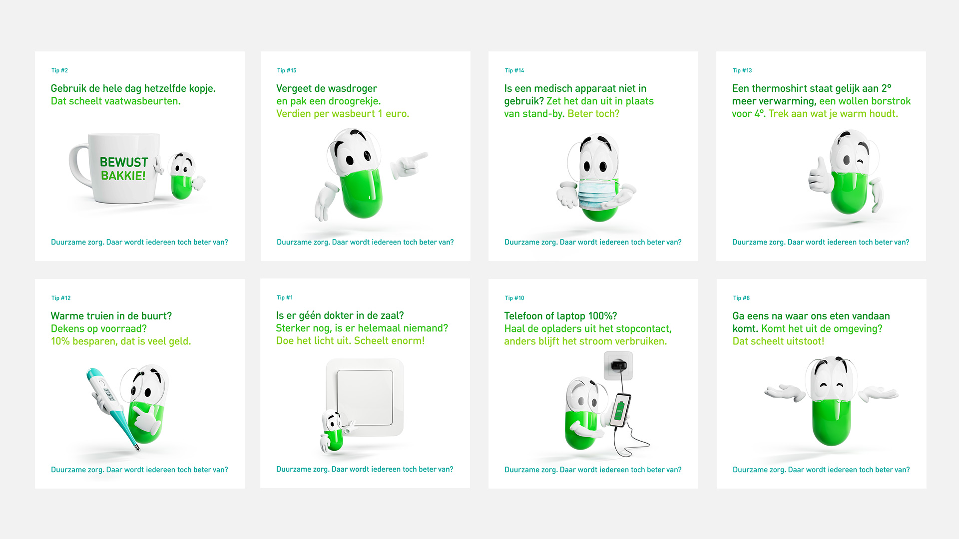 Milieu Platform Zorgsector (MPZ) vroeg ons een campagne te ontwikkelen die zorgorganisaties helpt hun medewerkers aan te zetten tot verduurzaming op de werkvloer én zo mogelijk ook thuis. Het delen van kennis en ervaring over hoe eenvoudig bij te dragen, geeft zorgprofessionals al veel inzicht in groenere zorg. Hoofdrolspeler in de campagne: de Verspilpil.