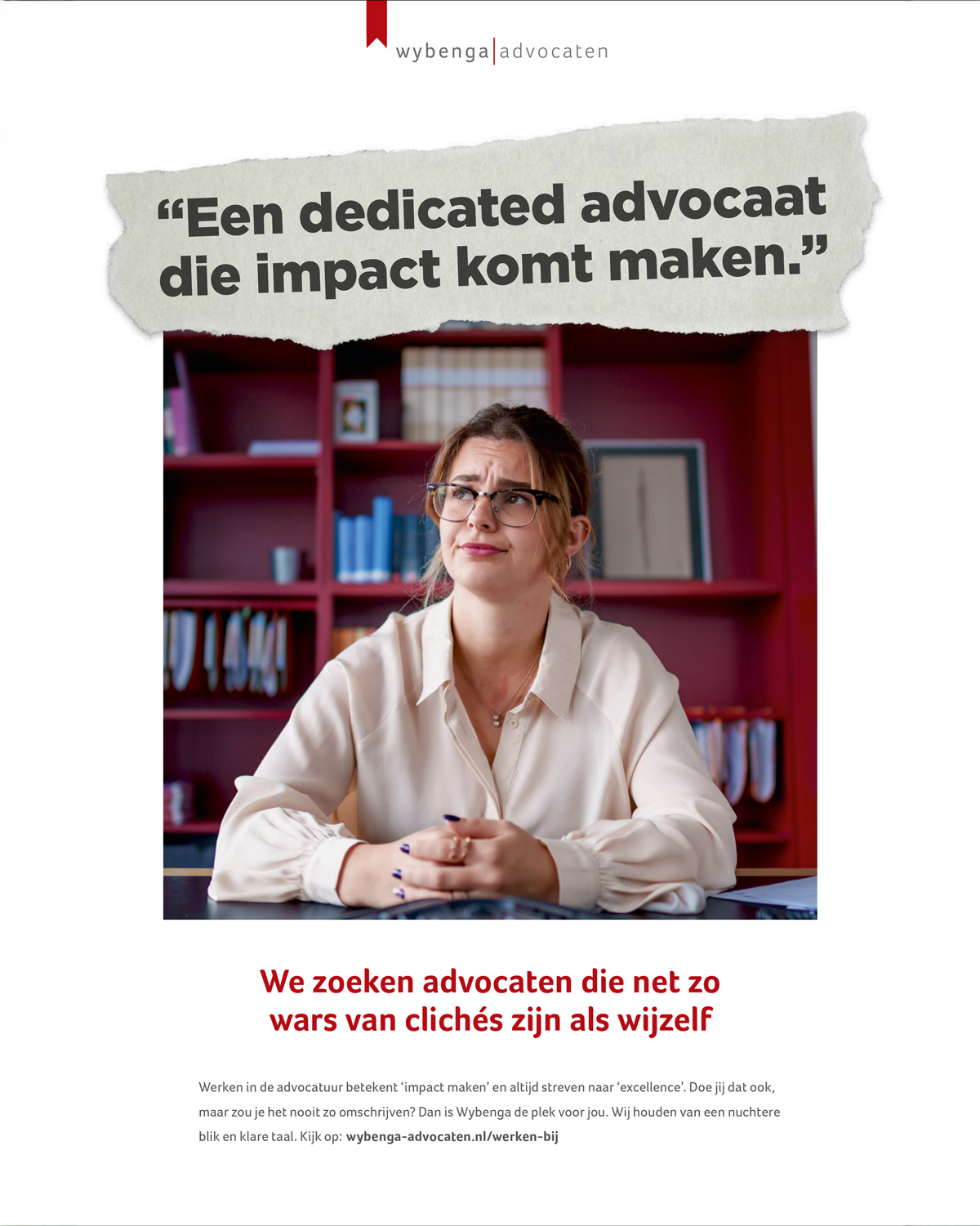 Voor de arbeidsmarktcampagne van Wybenga Advocaten, misschien wel het meest eigenwijze kantoor van Rotterdam en wijde omstreken, maakten we dankbaar gebruik van dat gegeven. Daar zoeken ze namelijk advocaten die net zo wars zijn van die clichés als zij zelf.